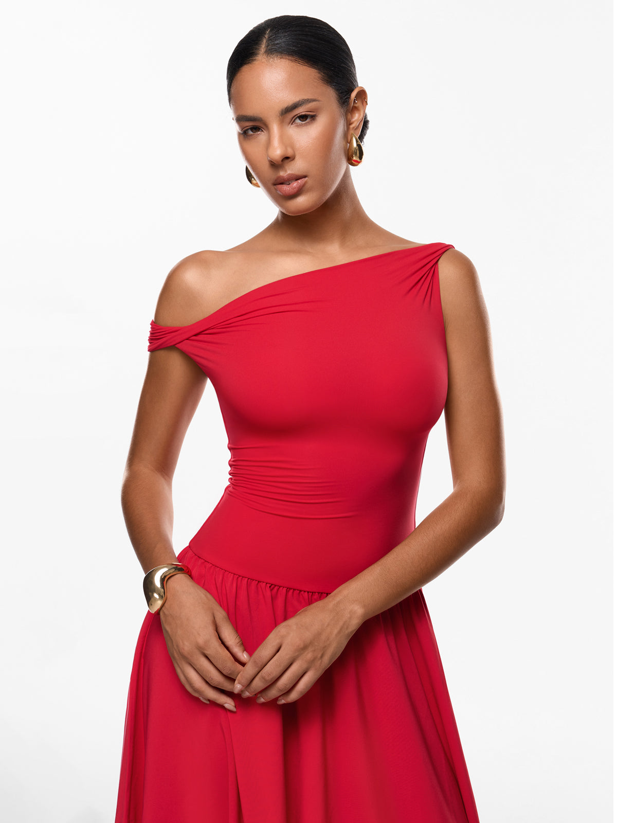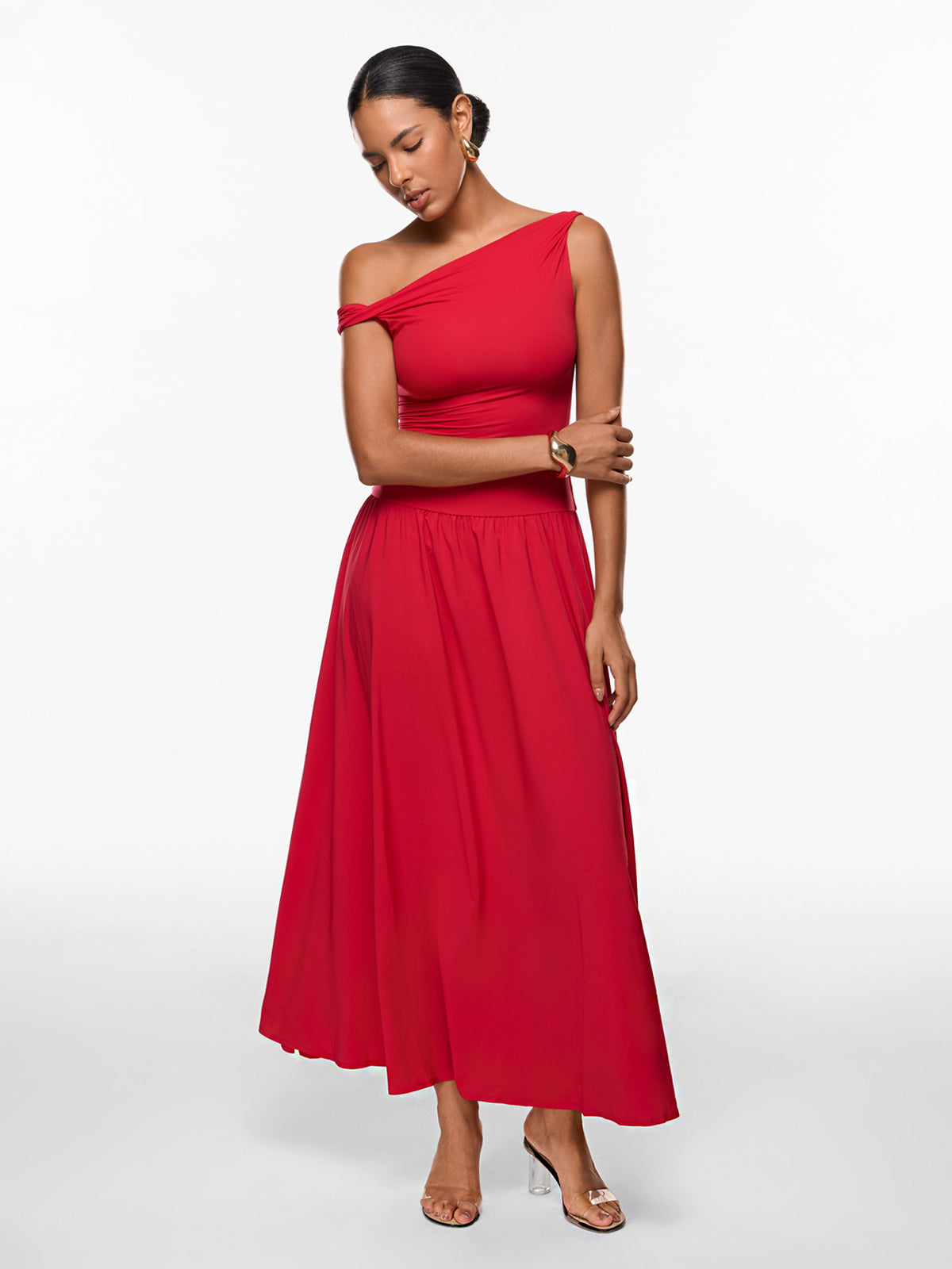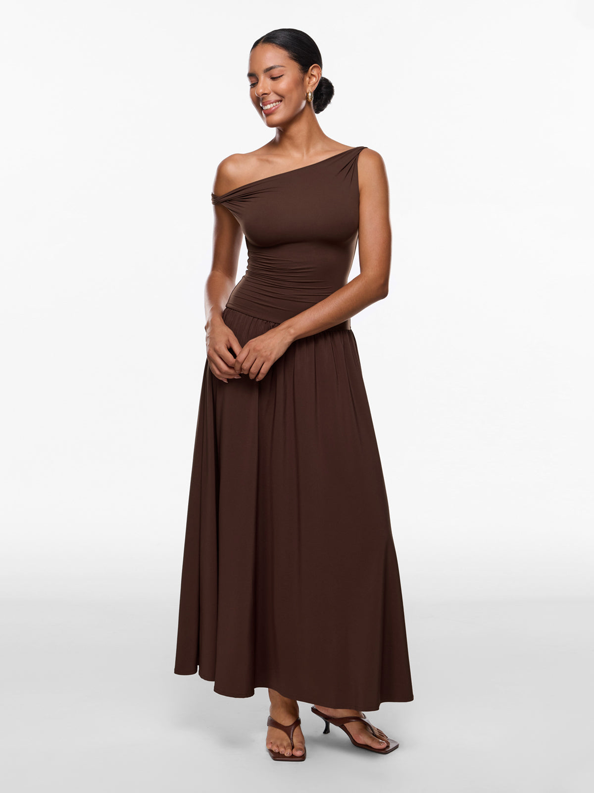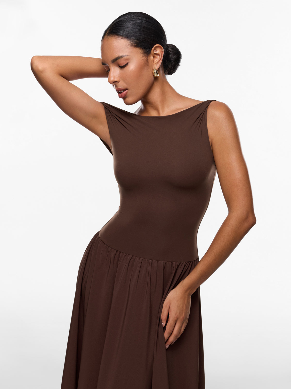 Discover the elegance of our versatile maxi dress. Designed with a double-layered, sculpting top and a flowing single-layer skirt, it beautifully flatters your curves. This ankle-length staple is perfect for any occasion, from work to an evening party. For a shorter fit, we recommend sizing down.